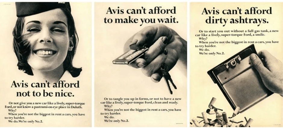 Slogans publicitaires basés sur l’argument de valeur unique d’Avis, une société de location de voitures qui, en 1962, perdait des millions de dollars et des parts de marché, mais a réussi à transformer un désavantage en avantage : « Quand vous n’êtes que No. 2, vous essayez plus fort. Avis ne peut pas se permettre d’être impoli. Avis ne peut pas se permettre de vous faire attendre. Avis ne peut pas se permettre d’avoir un cendrier sale ».